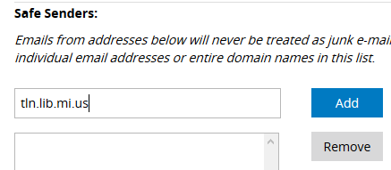 Here you can choose if you want to Whitelist the email address librarynotice@tln.lib.mi.us or the whole Domain.